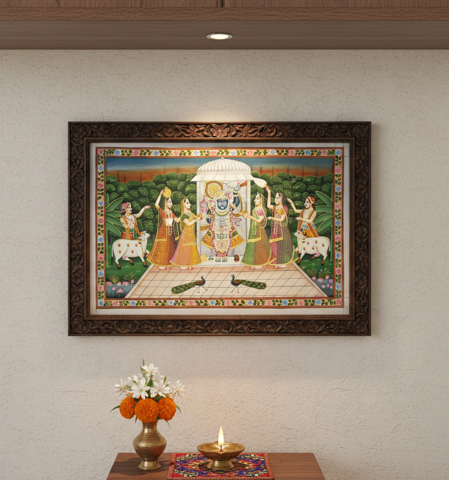 I bought this for my new homeβs mandir, and it has completely changed the energy of the room. The details on Shrinath Jiβs face and the gopis are so intricateβyou can tell itβs genuine handwork and not a print. It arrived very securely rolled in a tube. I got it framed with a simple gold border, and it looks divine. Truly a masterpiece!